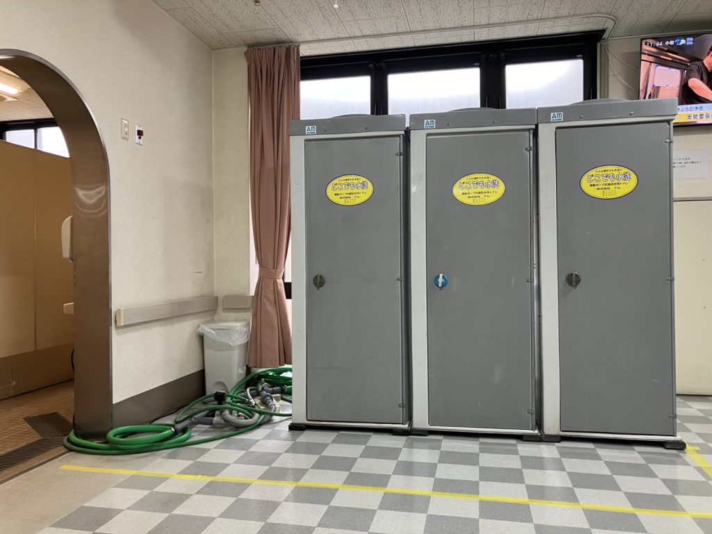 現場の看護師さん達は仮設トイレと聞いて従来通りの汲取りタイプの仮設トイレが来るのではないかと不安に思っておられましたが、水洗であるという事に非常に喜んで頂きました。